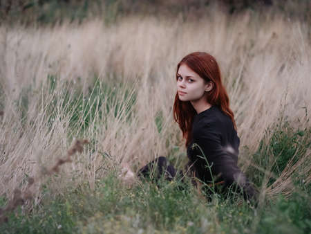 Woman in black dress red hair dry branches of grass