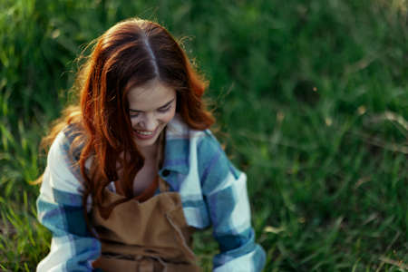 Ginger girl sits on the riverbank, beautiful summer background