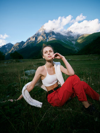 Mountain landscape outdoor female casual fashion field sky clouds nature scene with a relaxed vibe, a white crop top and red trousers, scarf draped over shoulder in a serene open air setting