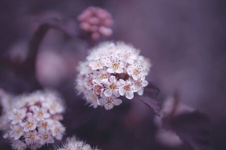 beautiful bright creamy flower on a background of purple leaves of a bush in close-up