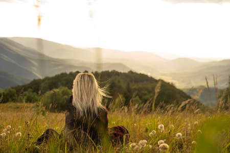Happy woman on the sunset in nature in summer