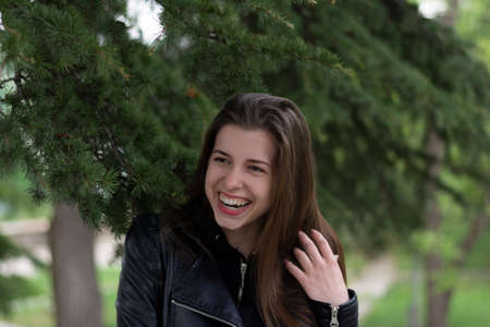 Portrait of a young beautiful girl in a black leather jacket.