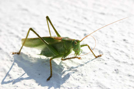 Big, green grasshopper sitting on asphalt road. Sunny summer background