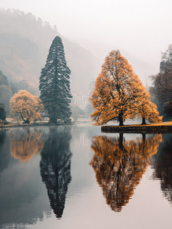 Autumn trees show colors of gold and red while reflected in a calm lake under soft morning light. Nature displays beauty in a quiet scene.