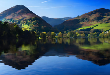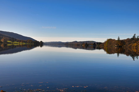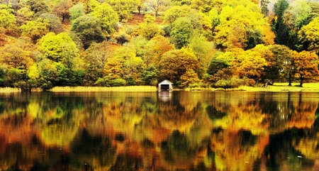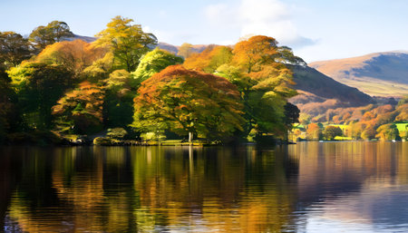 autumn landscape in the Lake District, the UK with trees reflecting in the water. Sunny autumn day