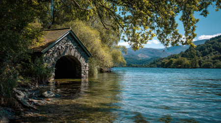 A stunning lakeside mansion sits quietly among vibrant gardens, beautifully reflected in the calm waters, creating a tranquil and picturesque landscape.