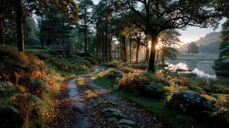Serene landscape featuring calm river reflecting trees and mountains at sunrise, with soft light illuminating scene and creating peaceful atmosphere