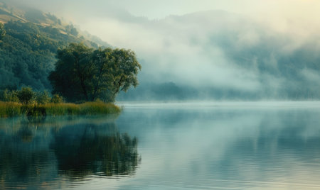 A tranquil lake scene showcasing mist rising from the water, surrounded by lush trees and mountains. Ideal for nature enthusiasts and peaceful settings.