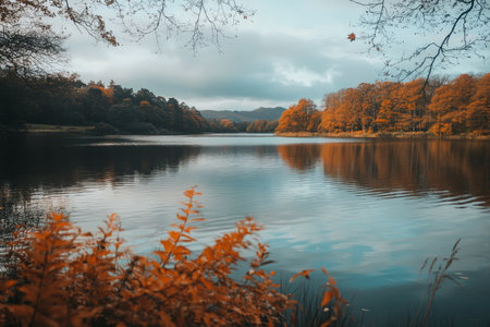 Serene autumn lake view surrounded by vibrant foliage reflecting in the calm waters