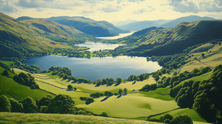 A breathtaking panoramic view of rolling hills and a tranquil lake, surrounded by lush greenery and under a partly cloudy sky, perfect for nature lovers.