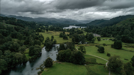 An overhead shot depicts a verdant valley traversed by a river, leading to a distant lake. The landscape features rolling hills covered in trees and expansive green fields under a moody, overcast sky. The image uses natural colors and lighting, possibly suitable for editorial or commercial applications.