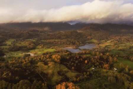 Aerial panoramic landscape of the Lake District town of Ambleside with Windermere lake on a cold Autumn morning with low lying misty conditions