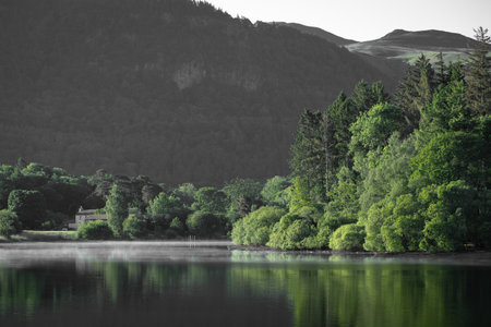 Reflections in lake Ullswater with early morning mist resting in the valleys at the foot of the mountains behind