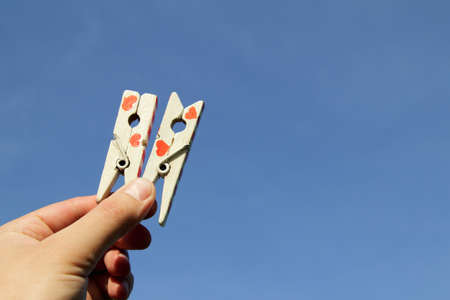 Retro couple of clothespins decorated with red hearts in a hand against the blue sky / similar in spirit