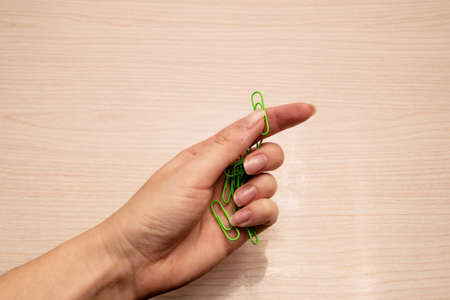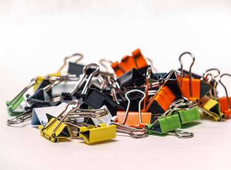 Set of multicolored paperclips on a white background. Selective focus. Close-up