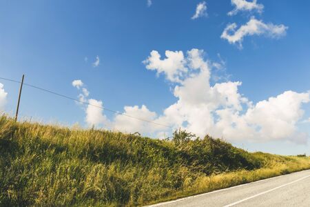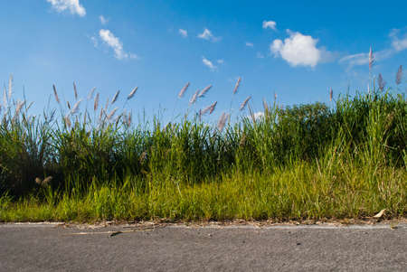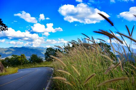 Flower of grass with blurred background of asphalt road, blue sky, white clouds and electric pole at countryside in Thailand