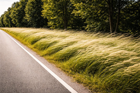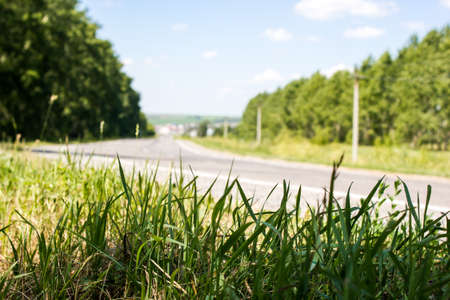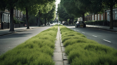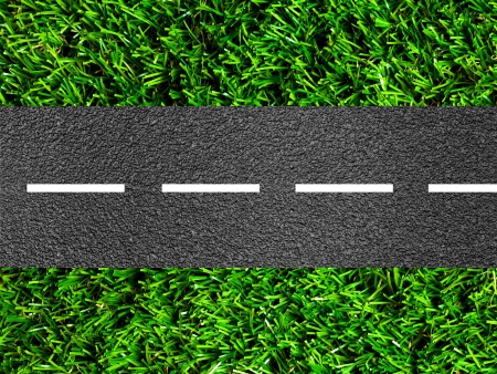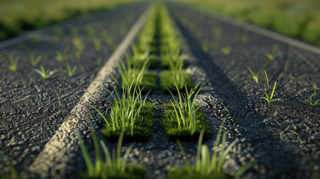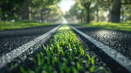 A fresh strip of vibrant green grass lines a smooth asphalt road, showcasing the beautiful contrast between natural elements and urban environments.