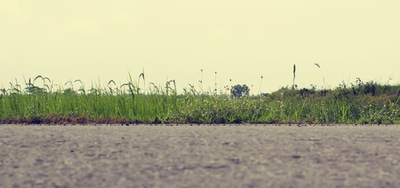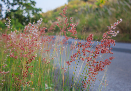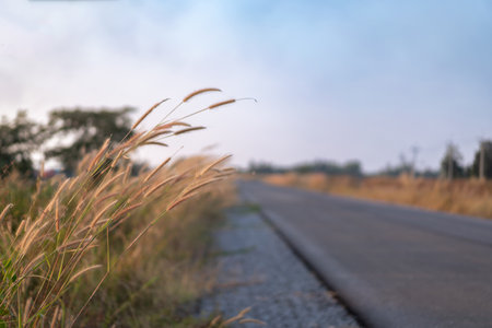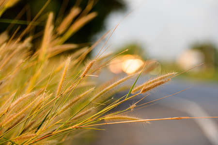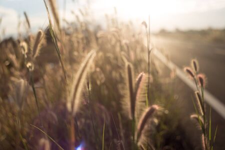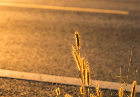 Flower of grass beside the way of asphalt road with white line traffic sign and morning warm light
