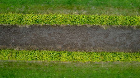 garden detail in aerial view with sand path going between two hedges. High quality photo