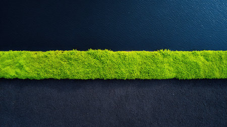 This stunning aerial view showcases a vibrant green moss contrasted against a dark surface beside a serene body of water, highlighting nature's beauty and tranquility.