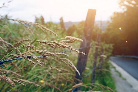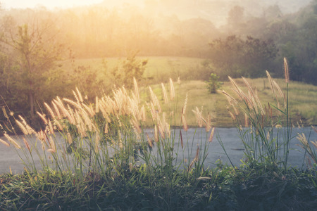 Morning grass flowers with soft sunlight, flowers in the countryside. Wild grass flowers with morning sunlight.