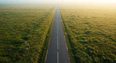Empty asphalt road with green grass and a fence at sunrise, bathed in warm golden light.