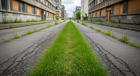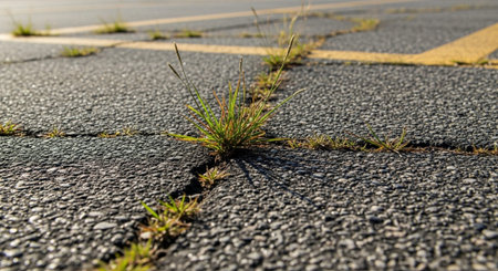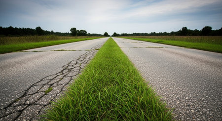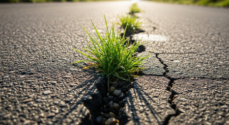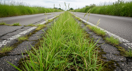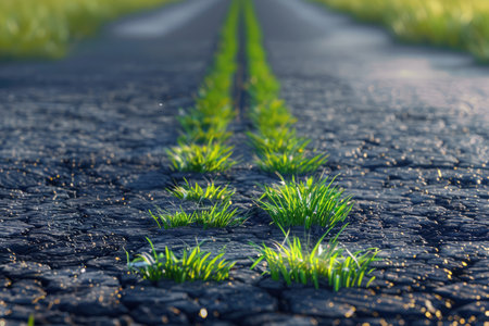 Grass growing as car tire tracks print in the middle of an asphalt road, eco-friendly vehicle concept