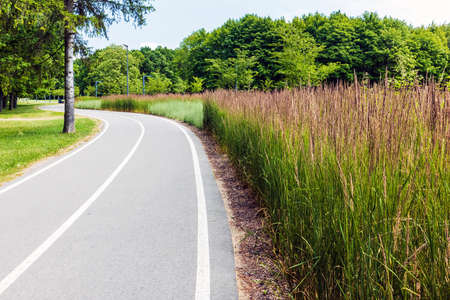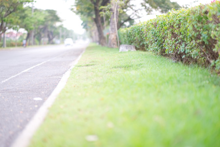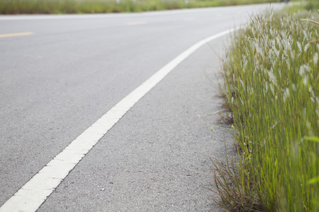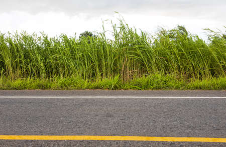 Horizontal view of asphalt road in Thailand. Background is grass and trees that grow thickly.