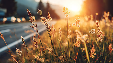 Grass flowers on the road in the mountains at sunset. Landscape.