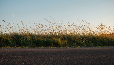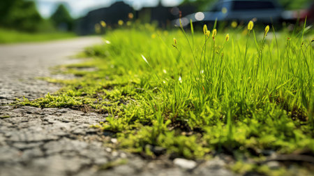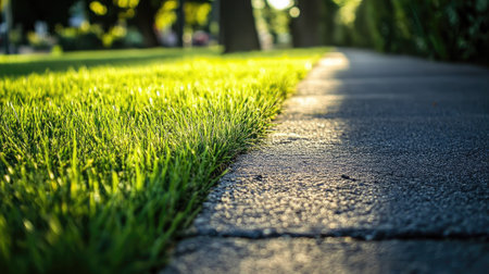 A captivating close-up of the edge where lush grass meets a smooth asphalt surface, beautifully illuminated by soft sunlight, creating a serene urban scene.