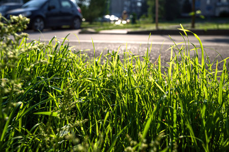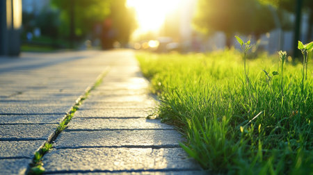 Captivating close-up of lush green grass growing along a concrete curbside with soft sunlight illuminating the scene, creating a serene urban ambiance.