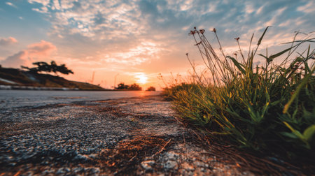 A captivating view of grass on a gravel road during a vibrant sunset, featuring dramatic clouds and warm colors that create a peaceful and serene atmosphere.