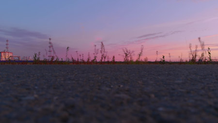 Beautiful sunset after a hot summer day. Clear sky with a pink sunset. The drone flies up against the background of the evening sunset. Huge areas of the north where oil is extracted.