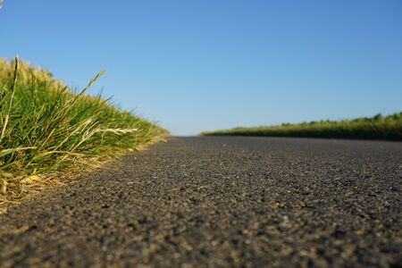 A black tire track on a bend in the road. A paved country road with green grass on the side of the road. Shooting at ground level. Selective focus.