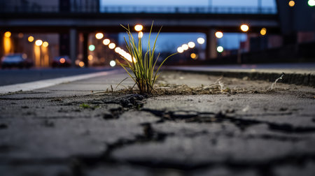 Vibrant green moss flourishes in a crack along a city street, symbolizing the tenacity of nature against urbanity. The contrast of life amidst concrete evokes a sense of beauty and hope.
