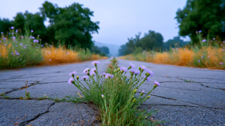 Wildflowers bloom amidst cracks in abandoned highway, grass growing where asphalt once existed. Distant trees contribute to peaceful natural atmosphere.