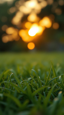 Close-up view of vibrant green grass covered in glistening dewdrops. The early morning sun casts a warm golden glow, creating a serene and refreshing natural landscape perfect for relaxation and tranquility.