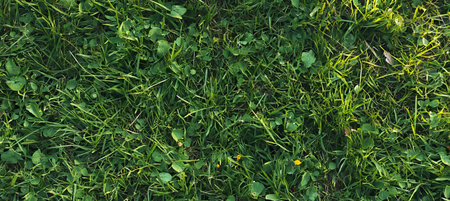 Vibrant Full Frame Shot of Lush Green Lawn with Detailed Blades and Leaves, Nature Background