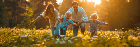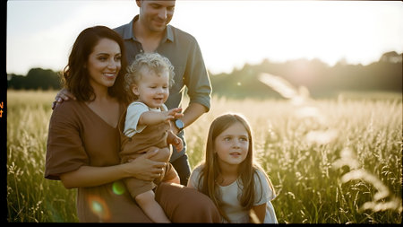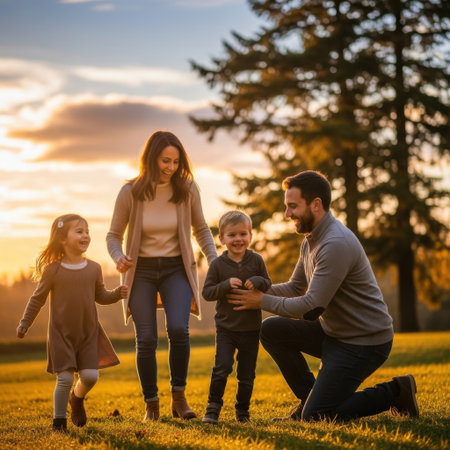 A family of four, consisting of two adults and two children, is enjoying a peaceful moment in a park during sunset. The family is standing on a grassy field with tall trees in the background. The mother is holding the hand of the little girl, while the father is kneeling down next to the little boy, who is smiling brightly. The warm hues of the setting sun cast a golden glow over the scene, creating a serene and heartwarming atmosphere.