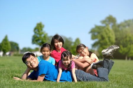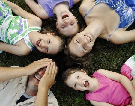Close-up camera of a mother, father and children who are lying on the lawn, touching each others heads, holding hands and laughing merrily.