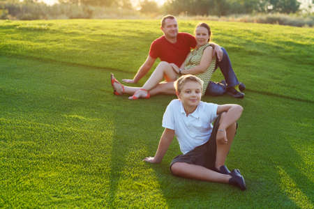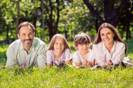 Photo of funny sweet preteen boy girl mother father dressed casual outfit lying green grass outside city park