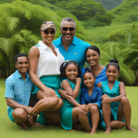 A family of five is depicted in a warm, outdoor setting, possibly during the golden hour. The image displays a family embracing each other with a soft, natural color palette. The composition uses natural light and a shallow depth of field, emphasizing the emotional connection. It is suitable for family-related content or lifestyle illustrations.