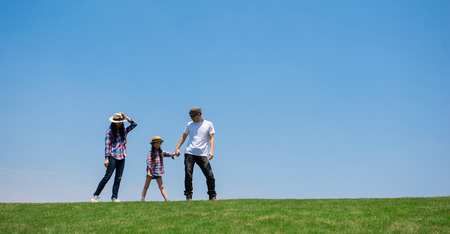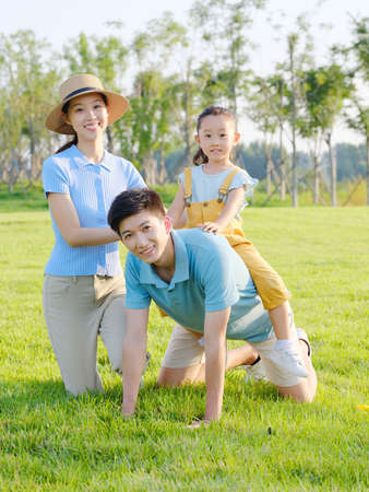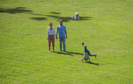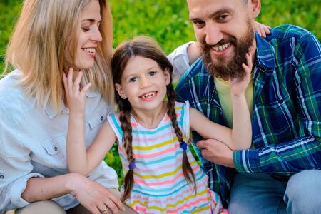 Happy young family spending time together outside in green nature. Parents, childhood, child, care, daughter, father, mother