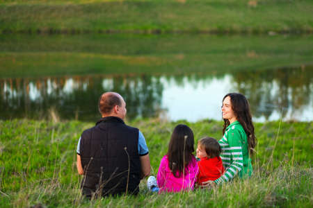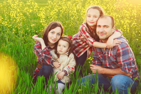 Happy family walking in field at sunset. Mother, father and children outdoors.