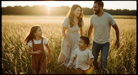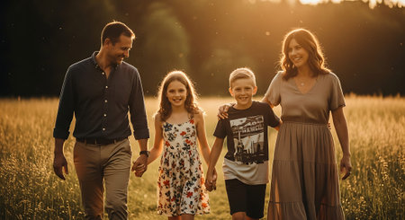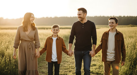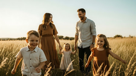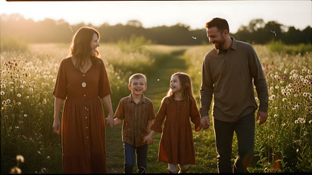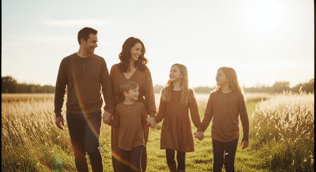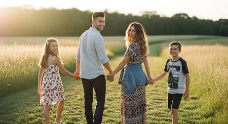A family of four holding hands and walking through a tall grass field during sunset, with warm lighting and a serene atmosphere.