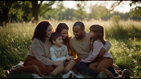 A family of five is embraced in a field with a warm sunset. They are sitting in the grass with sunlight illuminating their faces. The image features a shallow depth of field, natural lighting, and a soft focus. It could be suitable for lifestyle and family-related commercial purposes.