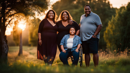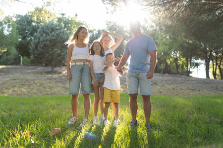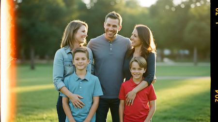 A smiling family of five stands together outdoors, illuminated by warm sunlight. The image features a diverse range of skin tones and clothing styles. The composition emphasizes closeness and happiness. Potential uses include illustrations of family values, healthy lifestyle, or positive relationships, suitable for various editorial and commercial projects.
