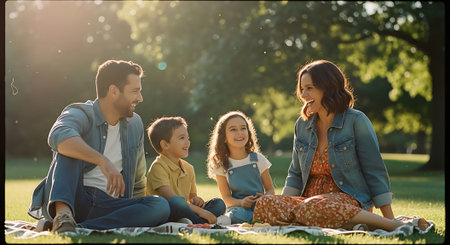 A family of four is captured in an outdoor setting, with parents and children. The composition showcases the individuals with natural light highlighting their features. The overall scene suggests a pleasant day. The image has potential uses in family and lifestyle projects.