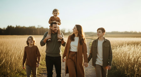 A family of four, including a child on shoulders, walking hand-in-hand in a field during sunset.