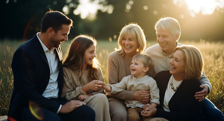 A happy multi-generational family sits together in a field at sunset, smiling and embracing, with warm lighting and natural backdrop.
